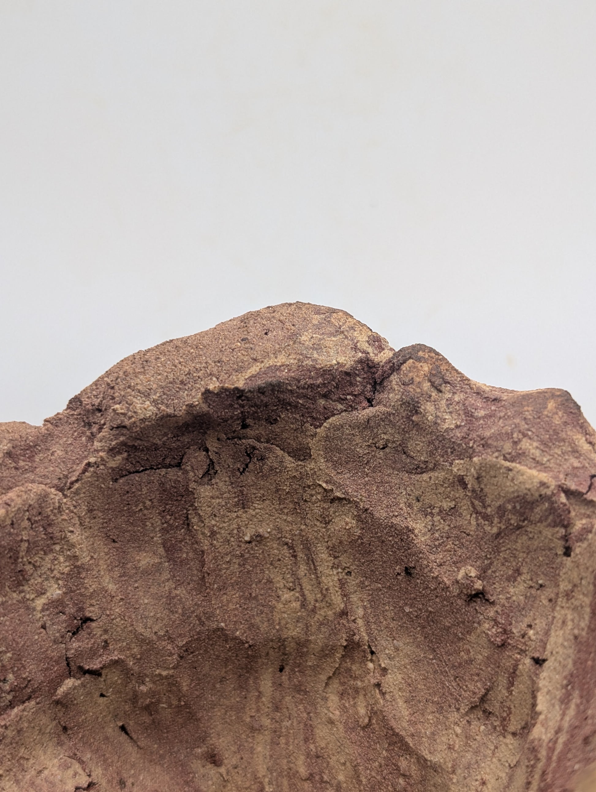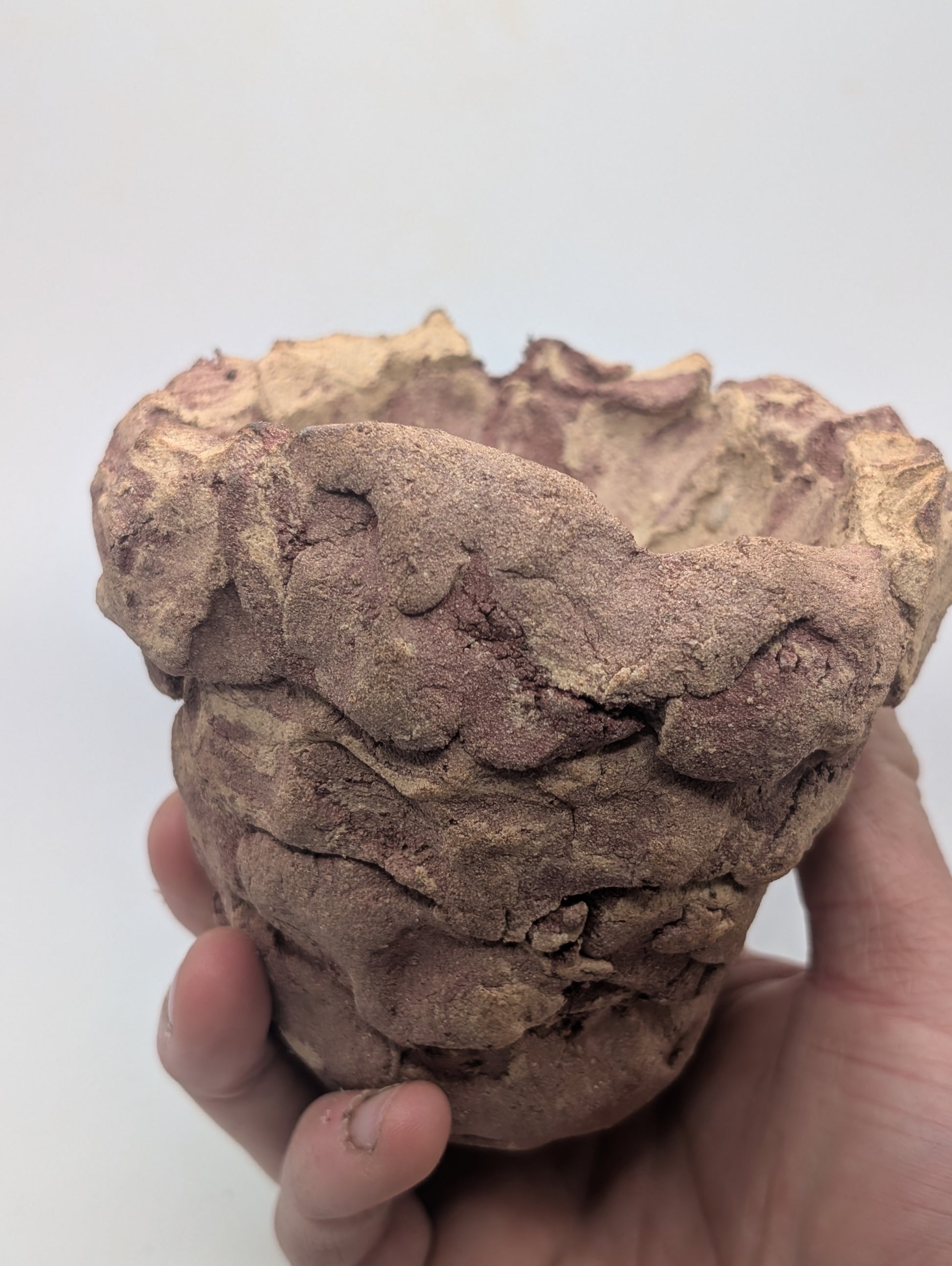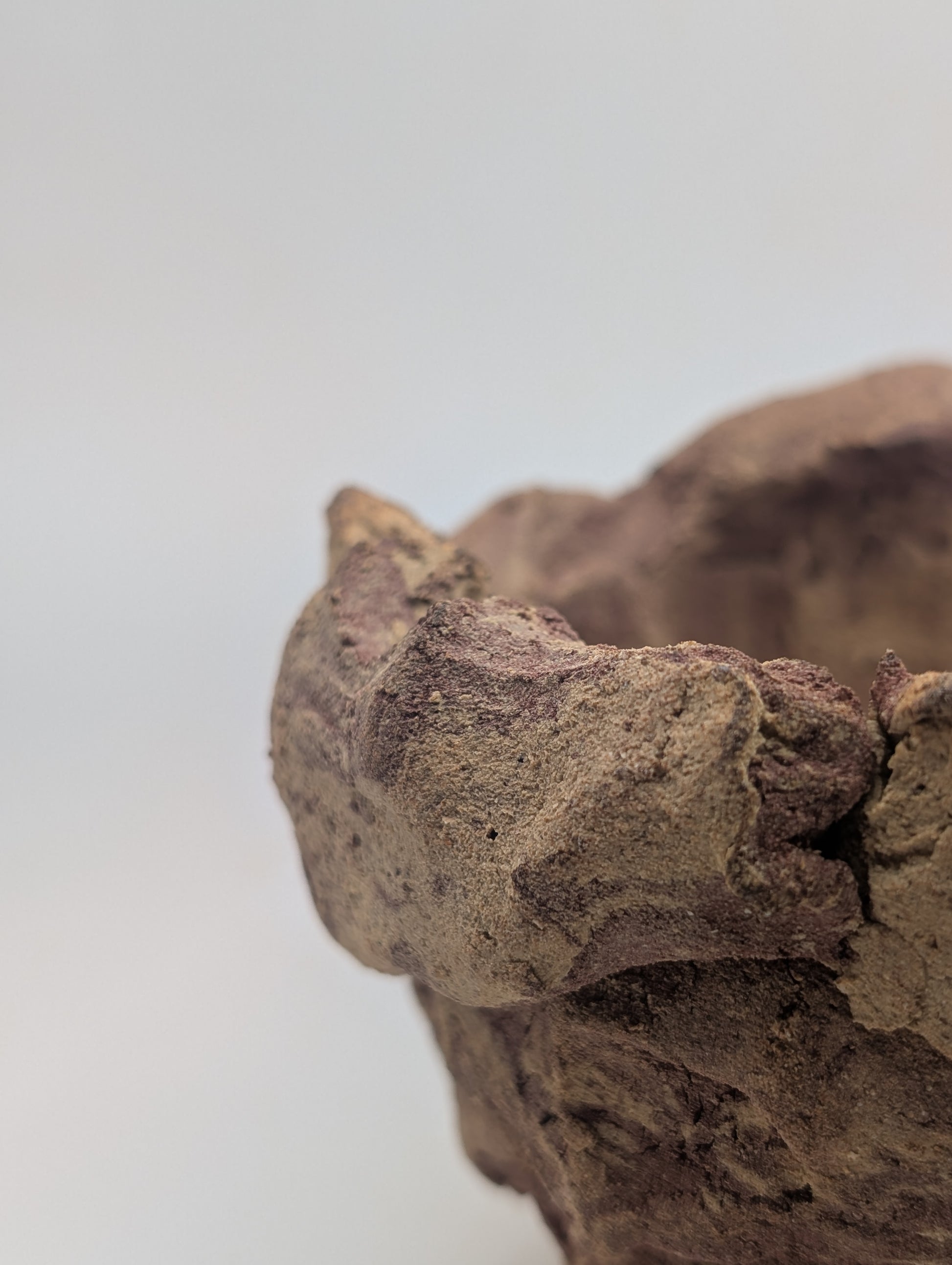 Looking like it was carved from the earth rather than shaped by hand, the layered, jagged surface has an organic, stratified quality, as if it were naturally formed over time. The contrast between the rough, almost crumbling texture and the structured vessel shape gives it a sense of tension—like something caught between ruin and creation.