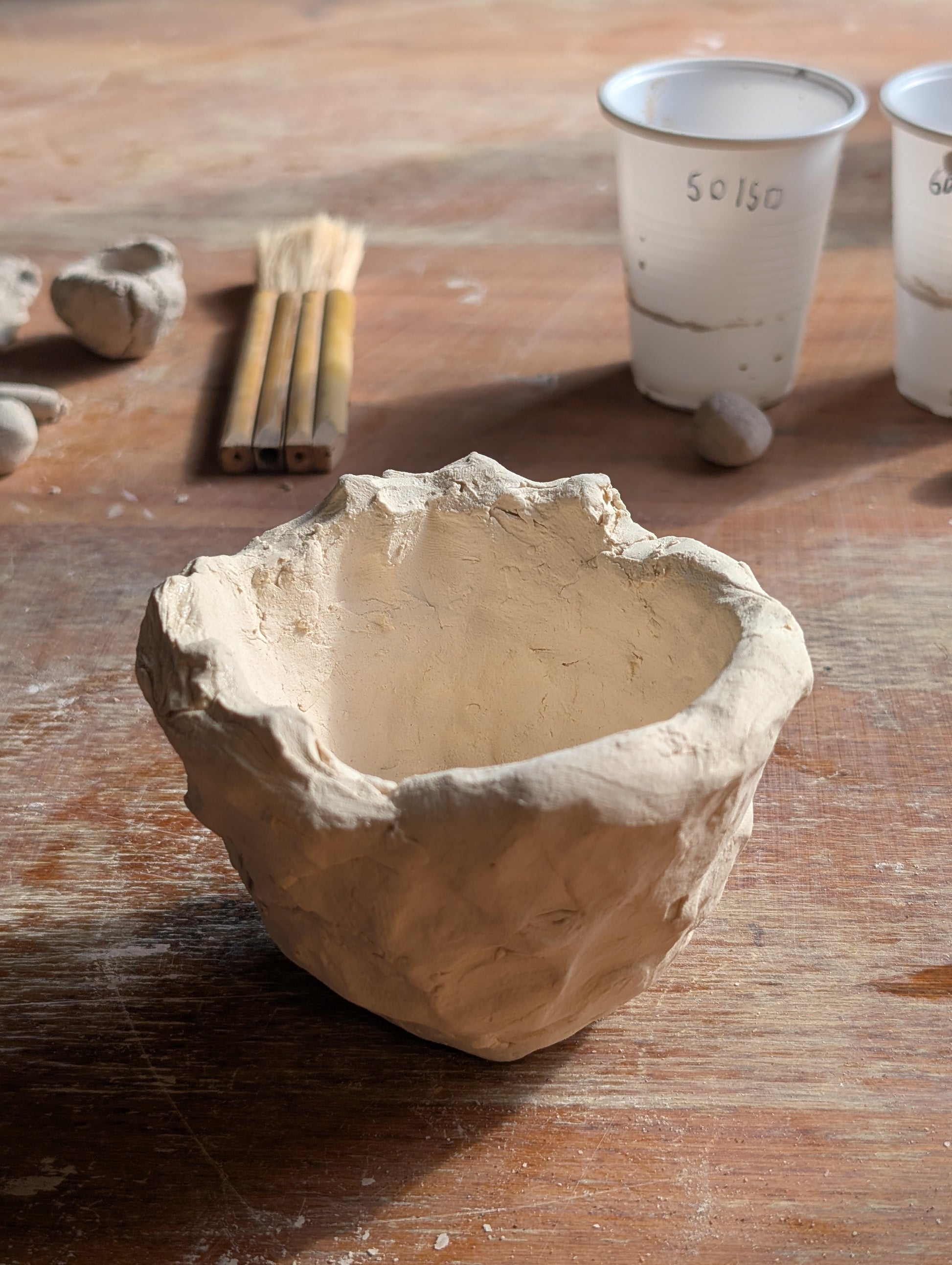 A hand-built clay vessel with a rough, organic texture. Intentionally irregular, with an uneven rim that gives it a raw, sculptural quality. The surface is marked by visible finger impressions and tool marks, emphasizing its handmade nature. The walls of the piece are thick, suggesting sturdiness, and the overall shape is slightly tapered at the bottom, allowing it to sit securely on the wooden surface. It has a primal, almost ancient aesthetic, reminiscent of early pottery traditions where function and form were shaped directly by the hands of the maker.