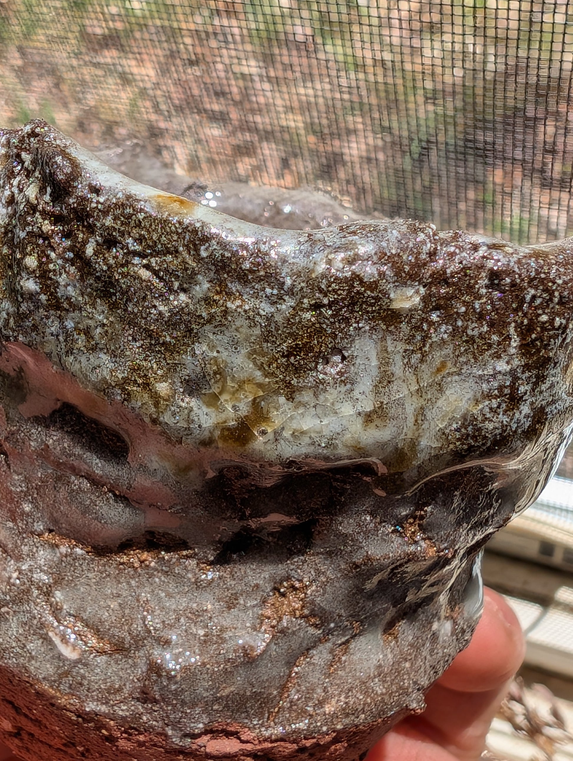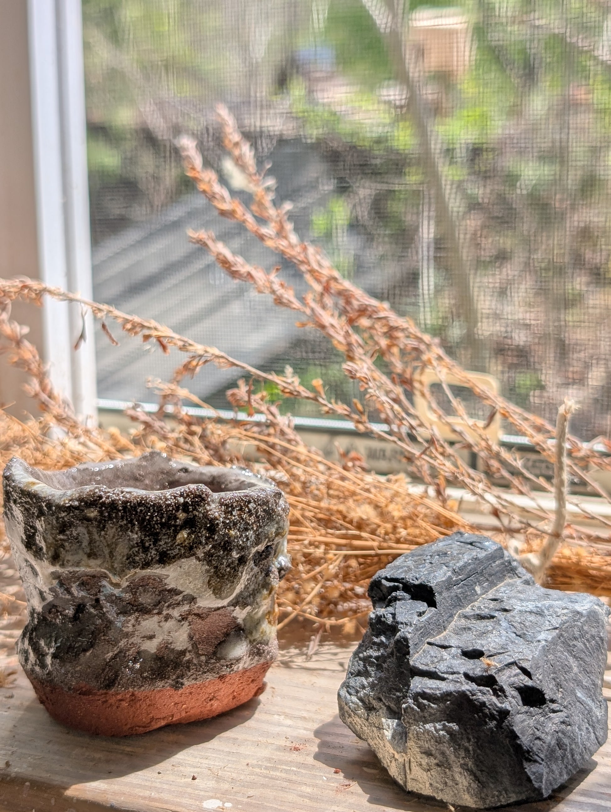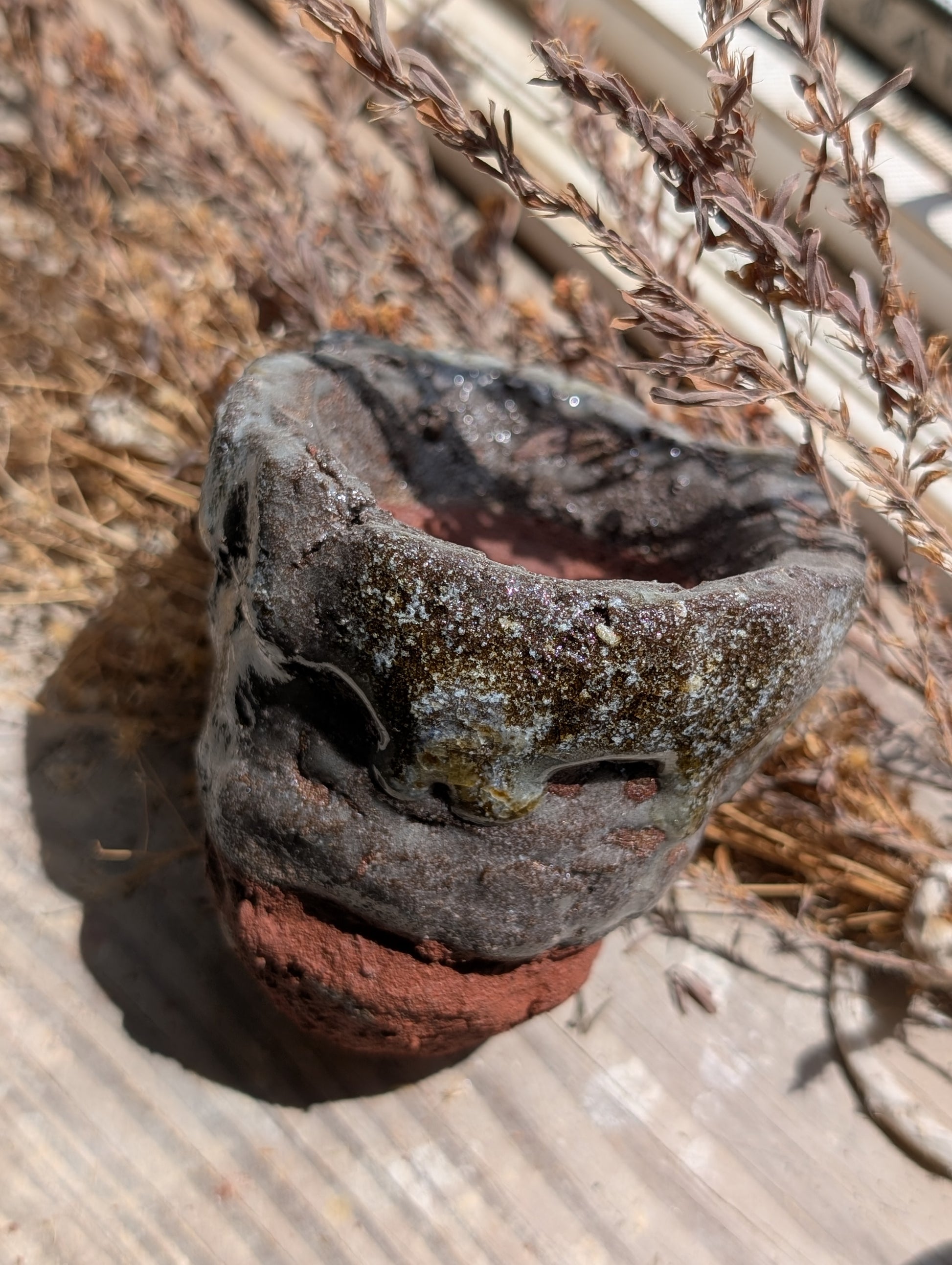 Locally dug red Virginia clay. Handbuilt due to its limitations for wheel throwing. Added sieved wood ash from wood firing sauna and glaze.