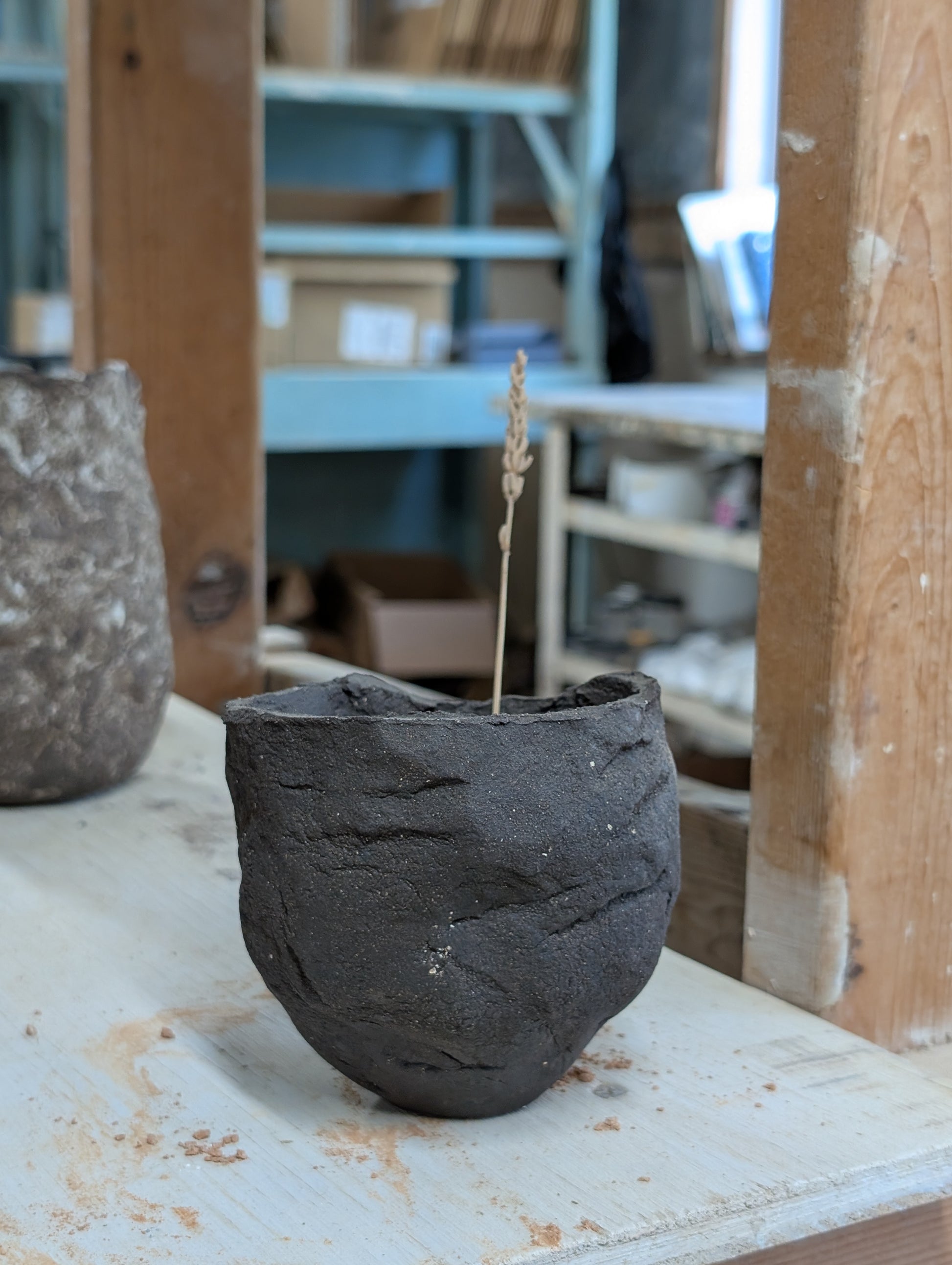 This vessel is handbuilt from raw black sculpture clay and fired in an electric kiln without glaze. The surface features soft, carved impressions — like traces left by a fingertip or tool — which ripple across the dark body in quiet gestures. The matte texture is lightly gritty, with occasional specks catching the light. Its form is gently asymmetrical, sitting somewhere between stillness and collapse. Not intended for functional use.
