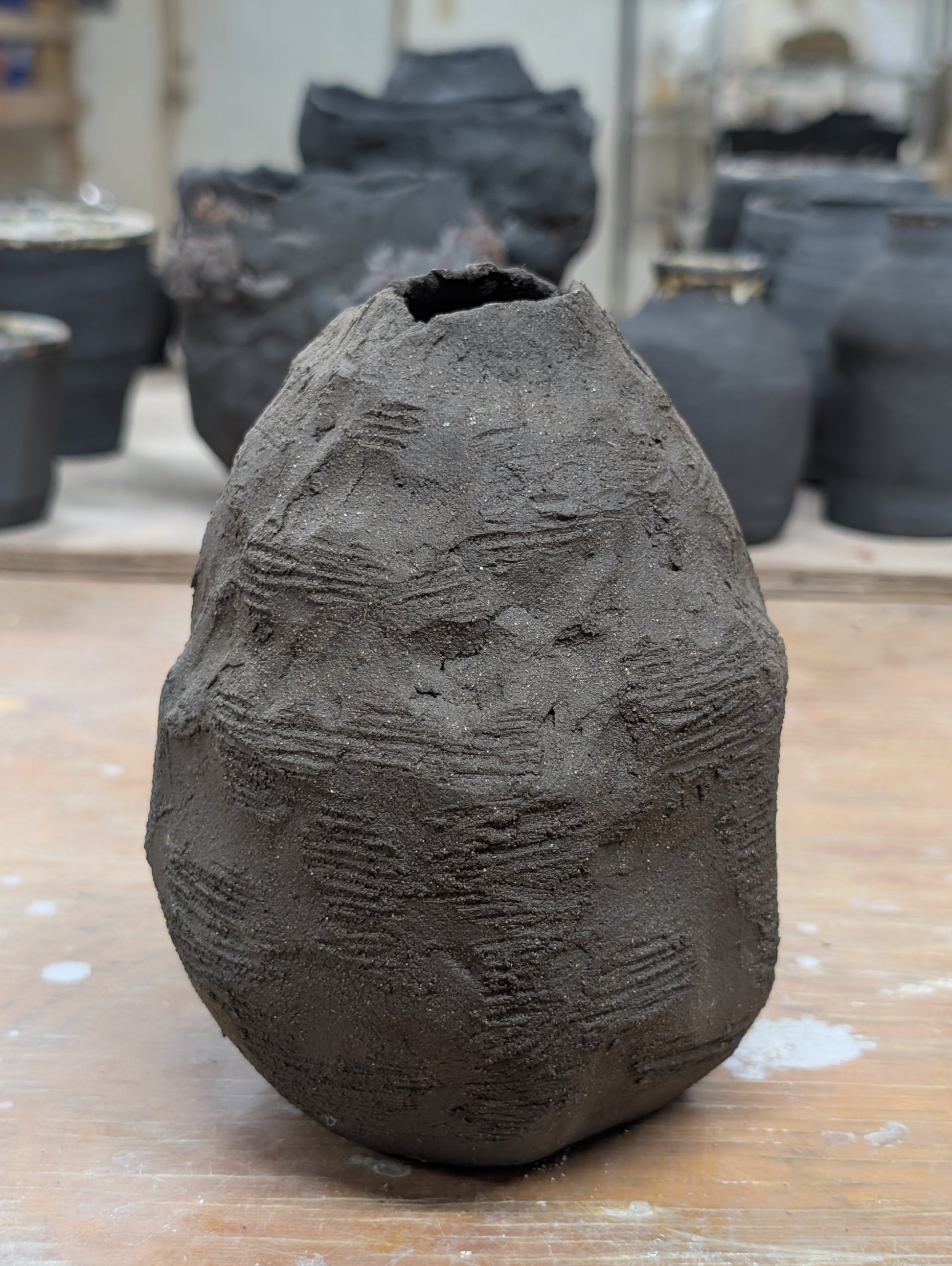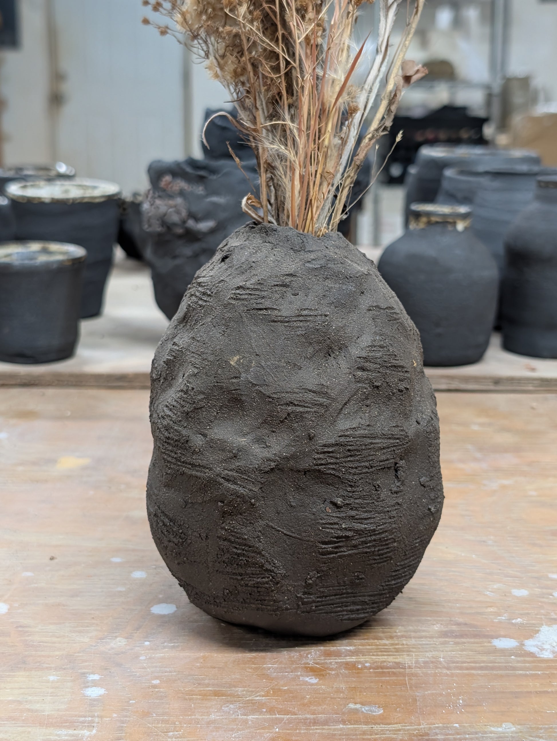 Textured sculptural black clay vessel for dry flowers