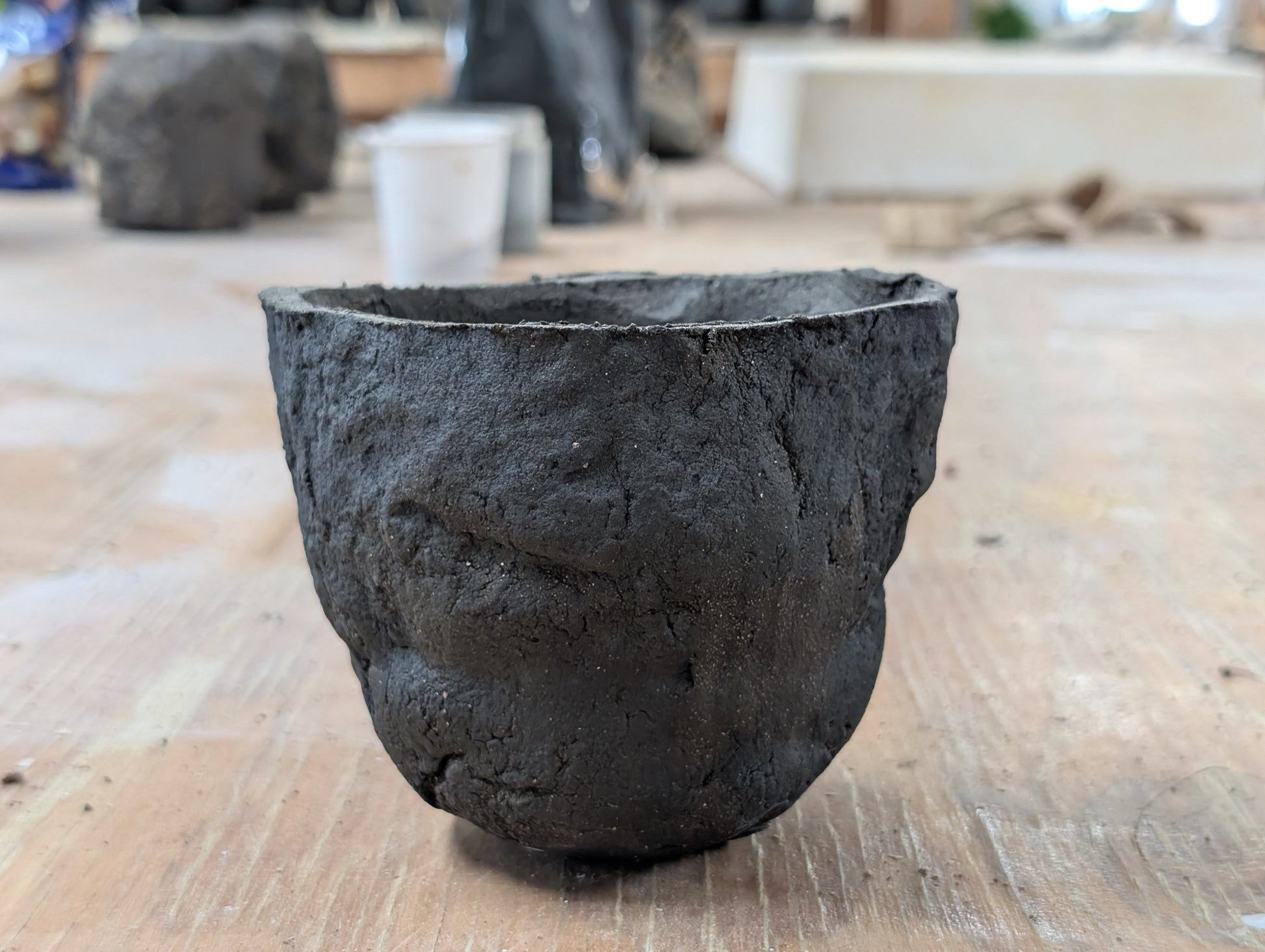 This handbuilt vessel is crafted from a deep black stoneware clay, featuring a rugged surface with embedded grit (~40%+ of claybody) for a raw, elemental texture. The irregular form and organic contours give this piece a powerful presence, making it equally suited as a sculptural accent or functional container.