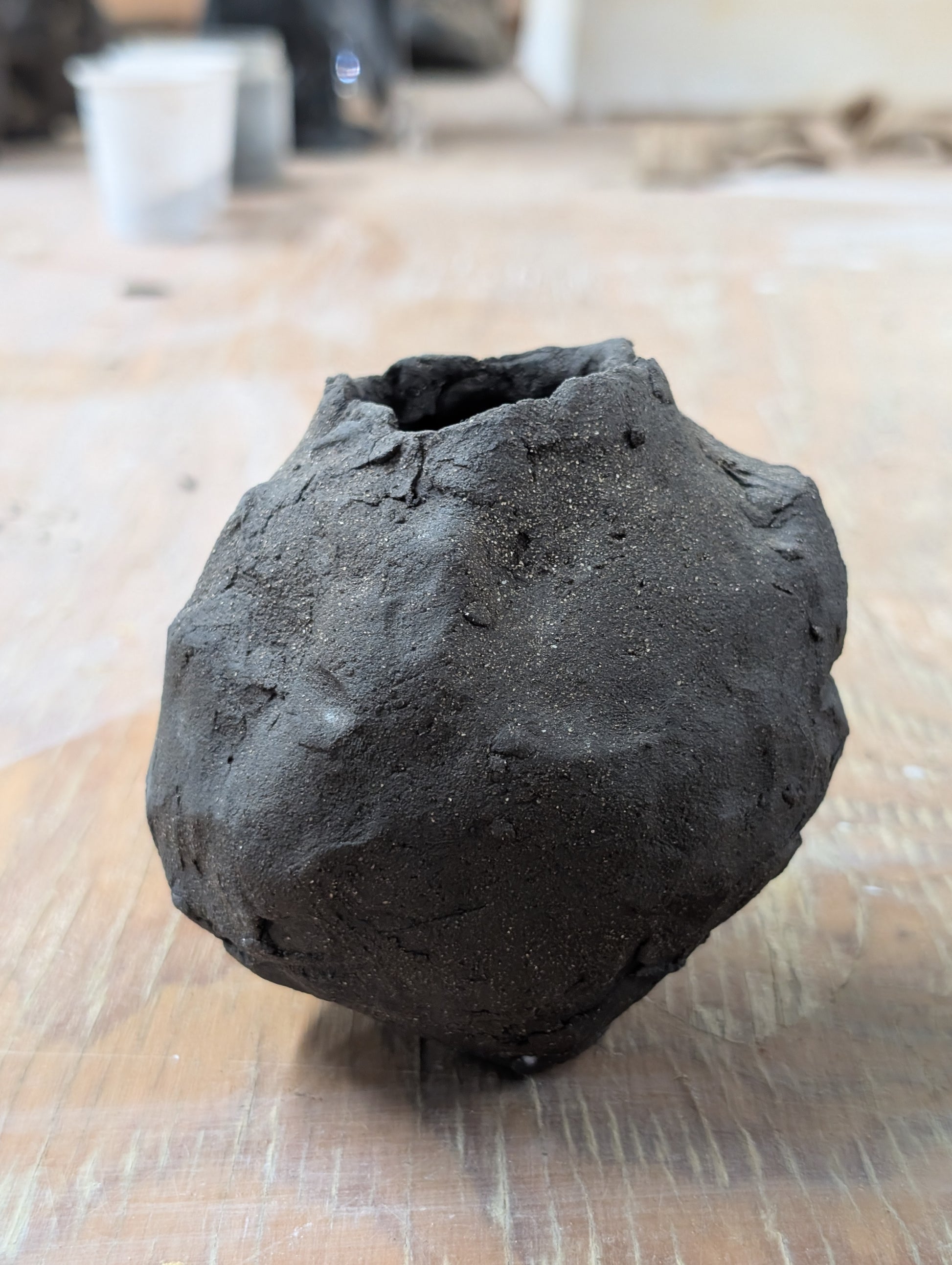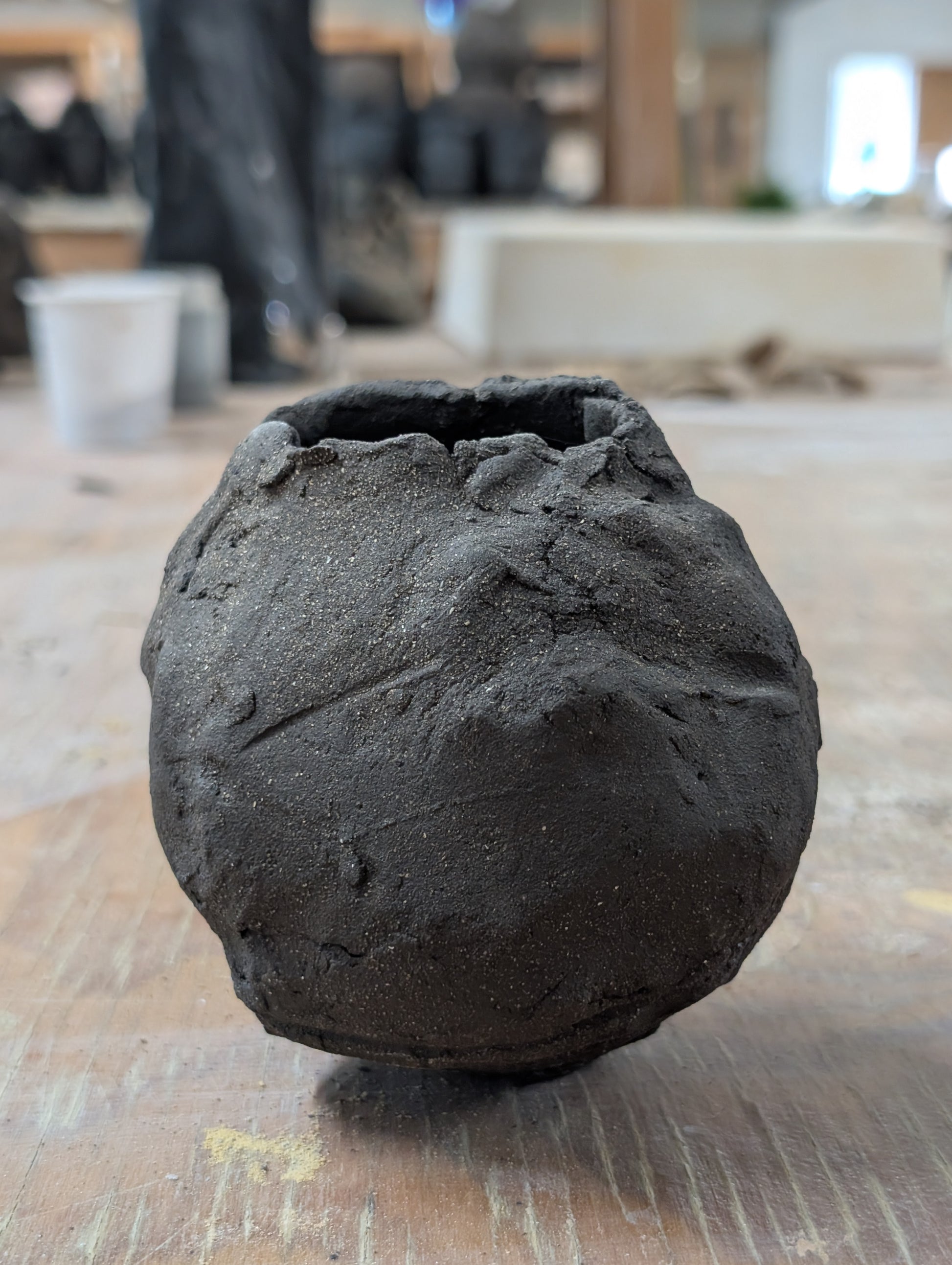 This piece is handbuilt from dense black stoneware clay, shaped into an organic, rounded form that feels both grounded and spontaneous. Its surface is unglazed, exposing the natural grit within the clay and highlighting the raw, geological quality of the material. The uneven rim and subtle surface shifts create a sense of movement, as though the vessel has been carved out by time and the elements.